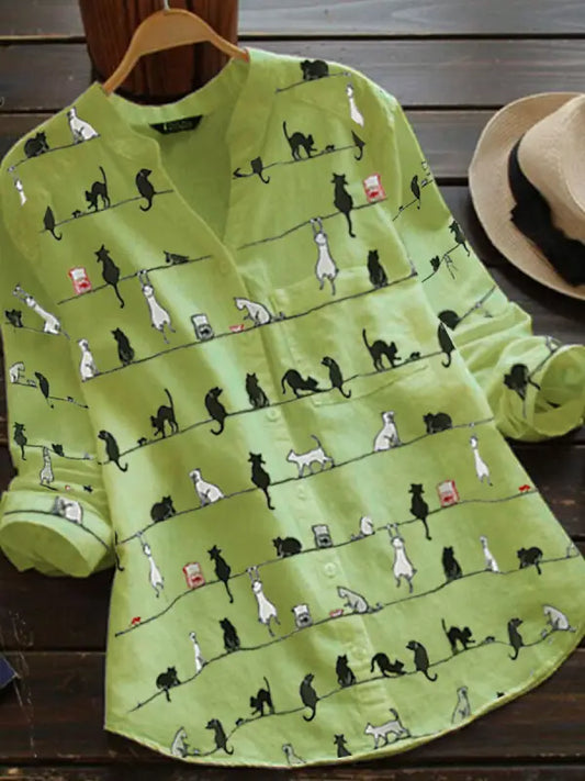 Dames - Lange Mouwen Blouse - Kattenprint - Elegante Mode - KATGENEGEN