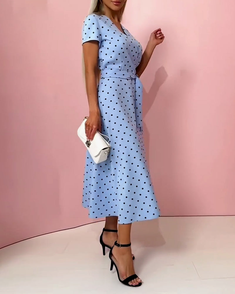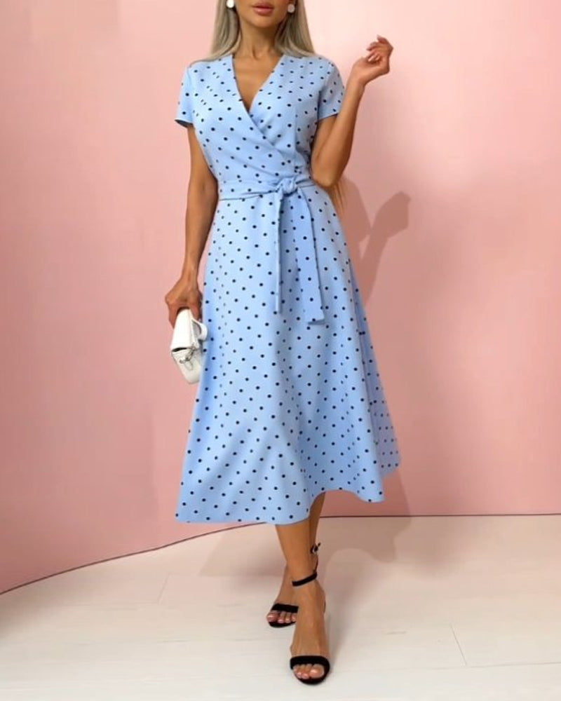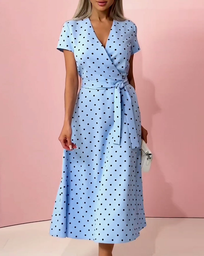 MARLENA – A-Lijn Jurk met Stippenprint, V-Hals en Vetersluiting