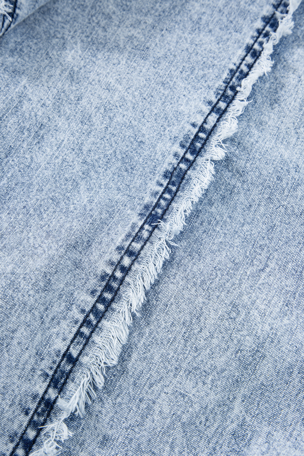 - Frisse stijl met edgy details: De combinatie van lichte wassing, gerafelde zoom en ruwe naden geeft een moderne, statement-achtige look.
